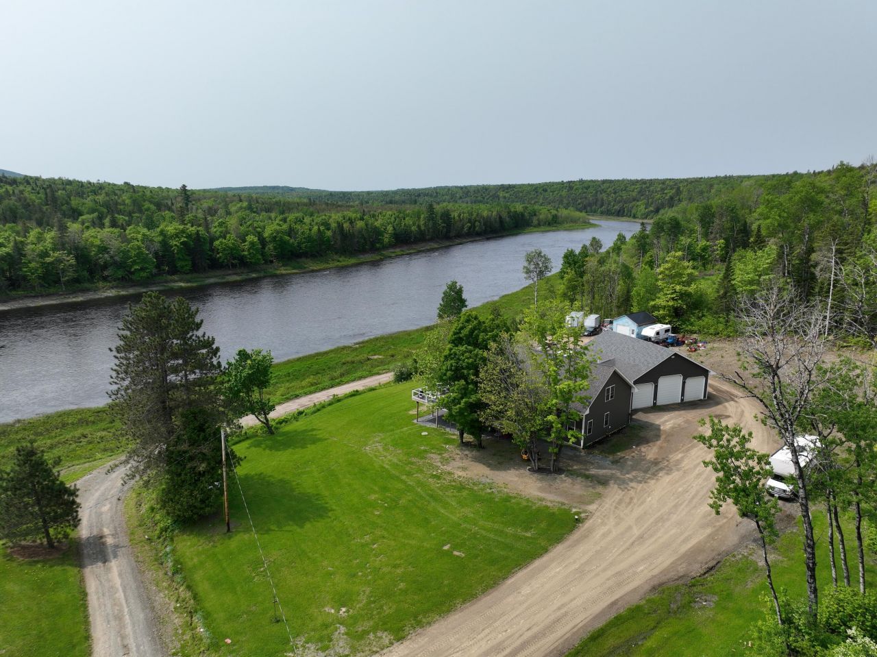 An Alaskan Contractor custom built this gorgeous home on a riverside cliff adjacent to and overlooking the shoreline of the Beautiful Aroostook River. In agent's opinion it is a ''Magnificent'' home with a ''Spectacular'' view. Every room in this home has the ''wow'' factor. The contractor is the owner and lived in Alaska for 28 years before coming back to his roots to build this dream home in Northern Maine. Home and attached huge, insulated garage are built to Precise standards with the very best of materials that are clearly evident. It is without reservation, the nicest well-built home for comfort and elegance that I have had the privilege to list in my over 22 years of selling real estate. Beautiful ''Sunrises and Sunsets'' can be viewed from the ''composite'' decking and Living Room with a ''wall of glass'' facing the river with abundant natural light and pine vaulted ceiling. Spacious kitchen features granite countertops, top quality maple ''easy-close'' cabinetry, Stainless appliances with a large island bar with breakfast nook. Primary bedroom is colossal with sitting area, walk-in closet, bath with double granite vanity and 'walk-in' shower. Loft is expansive with a large family area and French doors leading to another bedroom with a half bath. Mudroom, leading to the garage, features another food pantry, laundry area, closet and the main entrance to the home. Walk out basement has an exercise room, nicely finished Pool room/man cave and full bath. Full composite decking surrounds the home and is 14 feet wide on the side facing the river. Located on the end of a town road that goes down over the cliff and continues along the riverbank. This is the ''Peace and Serenity'' living that is found in Northern Maine.
