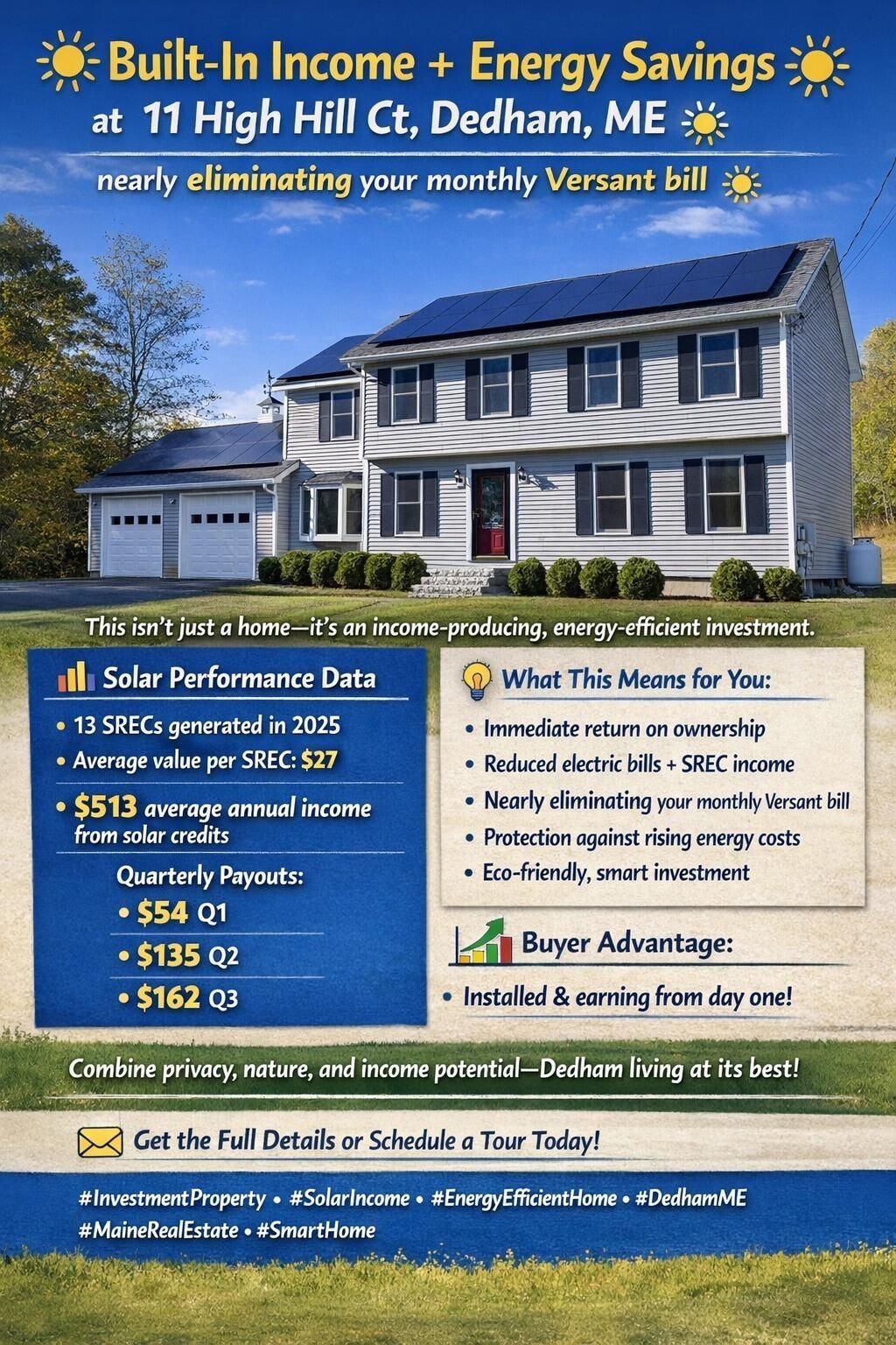 Want lower electric bills? Welcome to Solar Powered 11 High Hill! This beautifully maintained Colonial in Dedham, offering the perfect blend of classic charm and modern updates complete with solar panels keeping your electricity bills low!. Set on a generous 1.63-acre lot, this home provides both privacy and space while remaining conveniently close to town amenities.Step inside to discover a thoughtfully renovated and gorgeous kitchen, featuring updated cabinetry, stylish countertops, and modern appliances?ideal for both everyday living and entertaining. The custom tile backsplash is a showstopper! The inviting floor plan continues into spacious living and dining areas, filled with natural light and timeless character. Upstairs, the primary suite boasts a fully renovated bath, creating a relaxing retreat, while three additional bedrooms provide plenty of space for everyone, or even a home office.This property also features a rare combination of garage space: an attached two-car garage for daily convenience plus a detached oversized and heated garage with lofted storage above?perfect for hobbyists, car enthusiasts, or anyone in need of extra space. A dog containment area is already in place, making this an easy choice for pet owners.Outdoors, a spacious patio with hot tub sets the stage for relaxation and gatherings, surrounded by the beauty and privacy of the expansive lot.With 4 bedrooms, 2.5 baths, and a setting that blends open yard space with wooded privacy, this home is a true find in Dedham.